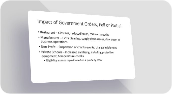 Impact of Government Orders, Full or Partial • Restaurant – Closures, reduced hours, reduced capacity • Manufacturer – Extra cleaning, supply chain issues, slow down in business operations • Non-Profit – Suspension of charity events, change in job roles • Private Schools – Increased sanitizing, installing protective equipment, temperature checks • Eligibility analysis is performed on a quarterly basis