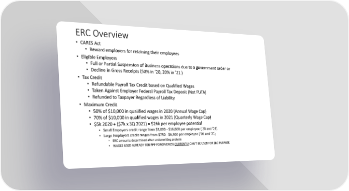 ERC Overview • CARES Act • Reward employers for retaining their employees • Eligible Employers • Full or Partial Suspension of Business operations due to a government order or • Decline in Gross Receipts (50% in ‘20, 20% in ’21 ) • Tax Credit • Refundable Payroll Tax Credit based on Qualified Wages • Taken Against Employer Federal Payroll Tax Deposit (Not FUTA) • Refunded to Taxpayer Regardless of Liability • Maximum Credit • 50% of $10,000 in qualified wages in 2020 (Annual Wage Cap) • 70% of $10,000 in qualified wages in 2021 (Quarterly Wage Cap) • $5k 2020 + ($7k x 3Q 2021) = $26k per employee potential • Small Empoyers credit range from $3,000 - $16,000 per employee (‘20 and ‘21) • Large Employers credit ranges from $750 - $6,500 per employee (‘20 and ‘21) • ERC amounts determined after underwriting analysis • WAGES USED ALREADY FOR PPP FORGIVENESS CURRENTLYCAN’T BE USED FOR ERC PURPOSE