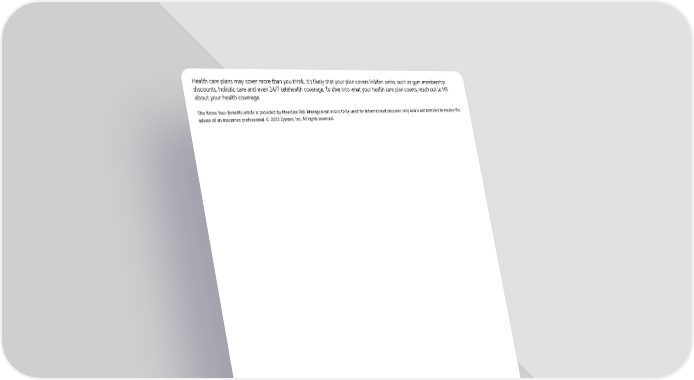 Health care plans may cover more than you think. It’s likely that your plan covers hidden perks, such as gym membership discounts, holistic care and even 24/7 telehealth coverage. To dive into what your health care plan covers, reach out to HR about your health coverage. This Know Your Benefits article is provided by Meridian Risk Management and is to be used for informational purposes only and is not intended to replace the advice of an insurance professional. © 2023 Zywave, Inc. All rights reserved.