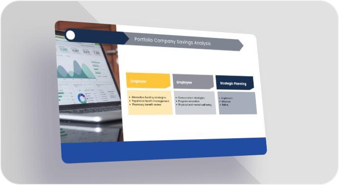 Portfolio Company Savings Analysis Strategic Planning Employer Alternative funding strategies Population health management Pharmacy benefit review Employee Consumerism strategies Program education Physical and mental wellbeing Implement Measure Refine