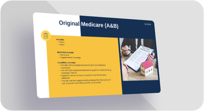 Includes: Part A Part B Most Plans Include: Part D and Supplemental Coverage In addition, includes: Includes Part A (Hospital Insurance) and Part B (Medical Insurance) You can add a separate Medicare drug plan for Medicare drug coverage ( Part D) Eligible to use any doctor or hospital in the US that takes Medicare You can also buy supplemental coverage that helps pay your out - of - pocket costs (like your 20% coinsurance) Original Medicare (A&B)
