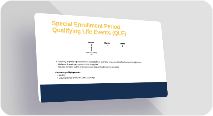 Special Enrollment Period Qualifying Life Events (QLE) Month 0 Month 1 Month 2 Following a qualifying life event you typically have a window of two months after the event to adjust your Medicare Advantage or prescription drug plan You can enroll in, switch, or discontinue a plan without incurring penalties Common qualifying events: Moving Leaving retiree, union, or COBRA coverage Month of qualifying QLE