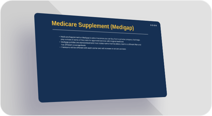 Medicare Supplement (Medigap) Medicare Supplement or Medigap is extra insurance you can buy from a private company that helps pay a share of some of the costs for approved services with Original Medicare Medigap policies are standardized and most states name them by letters. Each is a different Plan and has different coverage levels Premiums will be different with each carrier and will increase on an annual basis