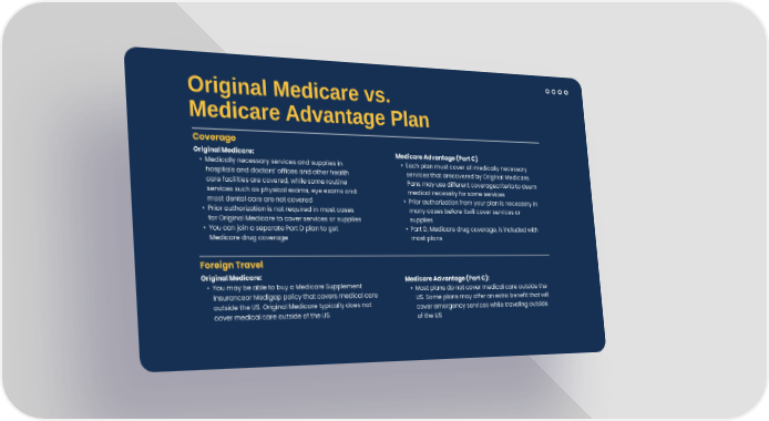 Original Medicare vs. Medicare Advantage Plan Coverage Original Medicare: Medically necessary services and supplies in hospitals and doctors offices and other health care facilities are covered, while some routine services such as physical exams, eye exams and most dental care are not covered Prior authorization is not required in most cases for Original Medicare to cover services or supplies You can join a separate Part D plan to get Medicare drug coverage Medicare Advantage (Part C) Each plan must cover all medically necessary services that arecovered by Original Medicare. Pans may use different coveragecriteria to deem medical necessity for some services Prior authorization from your plan is necessary in many cases before itwill cover services or supplies Part D, Medicare drug coverage, is included with most plans Foreign Travel Original Medicare: You may be able to buy a Medicare Supplement Insuranceor Medigap policy that covers medical care outside the US. Original Medicare typically does not cover medical care outside of the US Medicare Advantage (Part C): Most plans do not cover medical care outside the US. Some plans may offer an extra benefit that will cover emergency services while traveling outside of the US