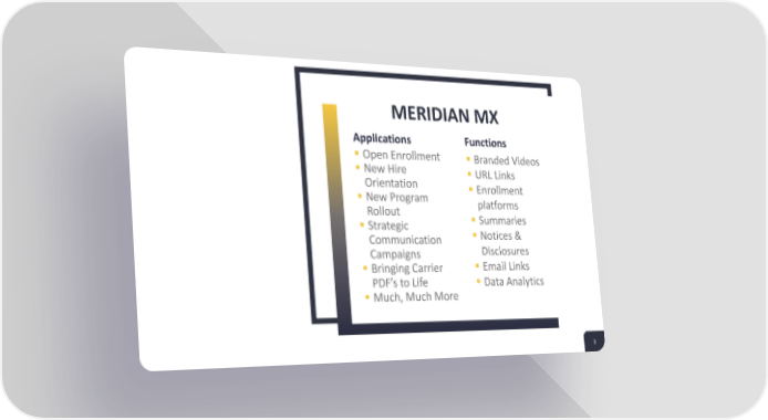MERIDIAN MX Applications Functions ▪ Open Enrollment ▪ Branded Videos ▪ New Hire ▪ URL Links Orientation ▪ Enrollment ▪ New Program platforms Rollout ▪ Summaries ▪ Strategic ▪ Notices & Communication Disclosures Campaigns ▪ Email Links ▪ Bringing Carrier PDF’s to Life ▪ Data Analytics ▪ Much, Much More 3