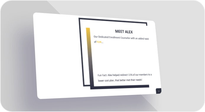MEET ALEX Our Dedicated Enrollment Counselor with an added twist of FUN… Fun Fact: Alex helped redirect 11% of our members to a lower cost plan, that better met their needs! 4