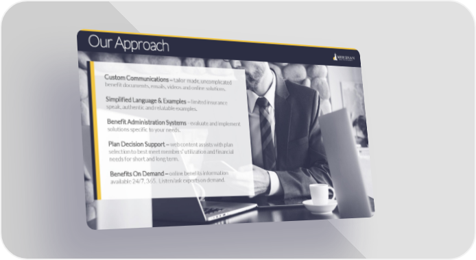 Our Approach Custom Communications –tailor-made, uncomplicated benefit documents, emails, videos and online solutions. Simplified Language & Examples –limited insurance speak, authentic and relatable examples. Benefit Administration Systems-evaluate and implement solutions specific to your needs. Plan Decision Support –web content assists with plan selection to best meet members’utilization and financial needs for short and long term. Benefits On Demand –online benefits information available 24/7, 365. Listen/ask experts on demand. 9