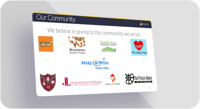 Our Community We believe in giving to the community we serve. 18 Meridian Risk Management Overview Page 5 Page 7volunteernewyork.orgwestchesterbiotechproject.orgsetonchildrens.orgthedannyfund.orgwish.orgthepicturehouse.orgpelhamartcenter.orgjlpelham.org