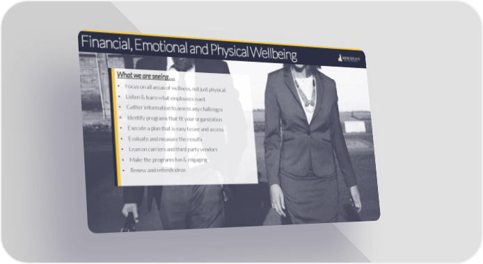 Financial, Emotional and Physical Wellbeing What we are seeing… • Focus on all areas of wellness, not just physical • Listen & learn what employees want • Gather information to assess any challenges • Identify programs that fit your organization • Execute a plan that is easy to use and access • Evaluate and measure the results • Lean on carriers and third party vendors • Make the programs fun & engaging • Renew and refresh ideas