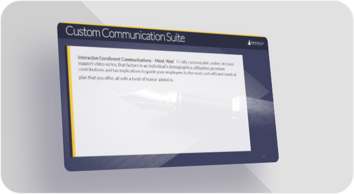 Custom Communication Suite Interactive Enrollment Communications –Meet ‘Alex’ A Fully customizable, online, decision support video series, that factors in an individual’s demographics, utilization, premium contributions and tax implications to guide your employees to the most cost-efficient medical plan that you offer, all with a twist of humor added in. 10