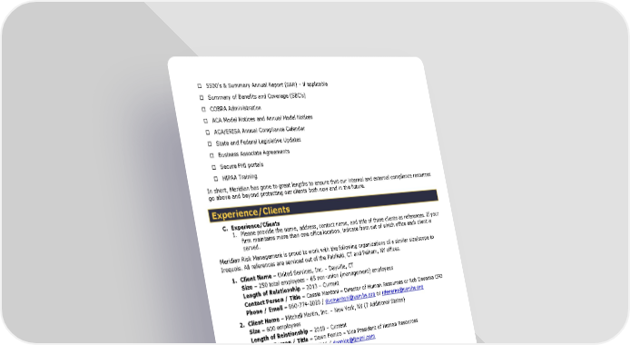 ¨ 5500’s & Summary Annual Report (SAR) – if applicable ¨ Summary of Benefits and Coverage (SBC’s) ¨ COBRA Administration ¨ ACA Model Notices and Annual Model Notices ¨ ACA/ERISA Annual Compliance Calendar ¨ State and Federal Legislative Updates ¨ Business Associate Agreements ¨ Secure PHI portals ¨ HIPAA Training In short, Meridian has gone to great lengths to ensure that our internal and external compliance resources go above and beyond protecting our clients both now and in the future. Experience/Clients C. Experience/Clients 1. Please provide the name, address, contact name, and title of three clients as references. If your firm maintains more than one office location, indicate from out of which office each client is served. Meridian Risk Management is proud to work with the following organizations of a similar size/scope to Iroquois. All references are serviced out of the Fairfield, CT and Pelham, NY offices. 1. Client Name – United Services, Inc. – Dayville, CT Size – 250 total employees – 65 non-union (management) employees Length of Relationship – 2013 – Current Contact Person / Title – Cassie Mantoni – Director of Human Resources or Rob Deverna CFO Phone / Email – 860-774-2020 / [email protected] or [email protected] 2. Client Name – Mitchell Martin, Inc. – New York, NY (7 Additional States) Size – 600 employees Length of Relationship – 2018 – Current Contact Person / Title – Dawn Ponico – Vice President of Human Resources Phone / Email – 646-300-7016 / [email protected] 3. Client Name – Aquinas Consulting – Milford, CT Size – 90 employees Length of Relationship – 2020 – Current Contact Person / Title – Sally Reed – Director of Human Resources Phone / Email – 203-876-2822 / [email protected] 4. Client Name – Seymour Sheridan, Inc. – Monroe, CT Size – 65 employees Length of Relationship – 2011 – Current Contact Person / Title – Janet Viel – Director of Finance Phone / Email – 203-261-4009 / [email protected] 12