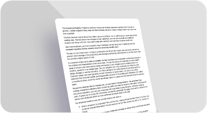 The Experience/Migration Predictive Analytics module can forecast employee migration from one plan to another, creates budget/funding rates and demonstrates scenarios where a change of plan may cost more than expected. The Risk Decision module shows how likely a group would be to ‘win’ by self-funding or level-funding their medical plan. The tool shows how changes in plan mechanics, such as, pooling levels and credibility impacts cost along with how much self-funded administration and stop-loss insurance would cost. Like most employers, we know Iroquois’s major challenges are the rising cost of healthcare and the increased regulatory factors centered around all employee benefits plans. The key to cost containment is trying to understand cost drivers that impact cost, educating members to prevent claims leakage in the program(s) and leveraging technology enhancements to not only lower costs but provide a higher quality of care. In a scenario where claims data is available, the lead consultant and underwriter would assist Iroquois in the analysis and interpretation of the claims data. Through the carrier provided data we could identify areas of concern and consumerism trends and develop a cost mitigation plan to address them on a monthly, quarterly or as needed basis. The cost mitigation plan may encompass such items as, plan design changes or member education. Our financial reports are customizable and would be specific to Iroquois’s needs, but would generally include information on gross claims, net claims, loss ratios, claimants that breached specific percentages/dollar amounts of the pooling point thresholds, the ‘rolling’ 12 months of claims, month by month enrollment, claims vs. premiums and historical claims for previous years. We are firm believers that to manage cost, you also need to manage behavior. We understand that making conscientious decisions about consuming health care requires access to information and that given the correct education, you and your employees will make better buying decisions, ultimately reducing costs. A great way to access this information and identify potentially damaging consumerism patterns is to survey your employees which we have performed numerous times in the past. Our employee-based surveys can provide Iroquois with data on: ¨ What is important to employees? How well do they understand their benefits? What is the best way to deliver relevant information? Provide scenarios on how they access care; ER vs. UC, Generic vs. Brand. ¨ By analyzing the responses, we can implement a strategy to reduce claims cost through education and/or plan design amendments Meridian has implemented several programs based on employee survey responses and has designed customized campaigns to provide information to the consumer. Here are just a few examples and recommendations: ¨ Telemedicine – having a low cost, convenient alternative for non-life-threatening treatments is paramount. During open enrollment and throughout the year information is available on when, why and how to use the benefit correctly. There is a heightened awareness around telemedicine, given the current coronavirus pandemic, so members should be aware the programs exist and utilizing the benefit. If we can continue to steer members toward the telemedicine benefit you would see a downturn in claims leakage for non-emergent issues. Telemedicine is now also available for 24