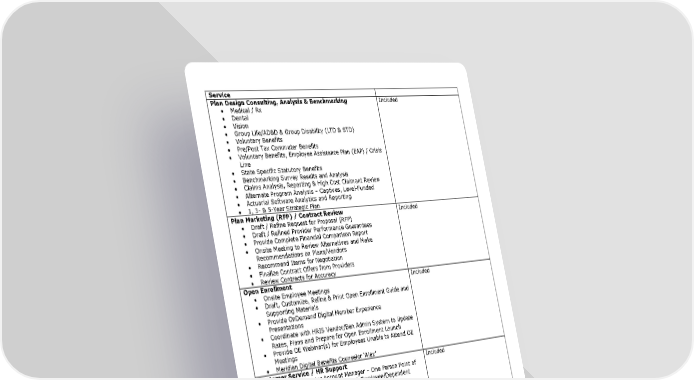 Service Plan Design Consulting, Analysis & Benchmarking Included • Medical / Rx • Dental • Vision • Group Life/AD&D & Group Disability (LTD & STD) • Voluntary Benefits • Pre/Post Tax Commuter Benefits • Voluntary Benefits, Employee Assistance Plan (EAP) / Crisis Line • State Specific Statutory Benefits • Benchmarking Survey Results and Analysis • Claims Analysis, Reporting & High Cost Claimant Review • Alternate Program Analysis – Captives, Level-Funded • Actuarial Software Analytics and Reporting • 1, 3- & 5-Year Strategic Plan Plan Marketing (RFP) / Contract Review Included • Draft / Refine Request for Proposal (RFP) • Draft / Refined Provider Performance Guarantees • Provide Complete Financial Comparison Report • Onsite Meeting to Review Alternatives and Make Recommendations on Plans/Vendors • Recommend Items for Negotiation • Finalize Contract Offers from Providers • Review Contracts for Accuracy Open Enrollment Included • Onsite Employee Meetings • Draft, Customize, Refine & Print Open Enrollment Guide and Supporting Materials • Provide OnDemand Digital Member Experience Presentations • Coordinate with HRIS Vendor/Ben Admin System to Update Rates, Plans and Prepare for Open Enrollment Launch • Provide OE Webinar(s) for Employees Unable to Attend OE Meetings • Meridian Digital Benefits Counselor ‘Alex’ Customer Service / HR Support Included • Dedicated Senior Account Manager – One Person Point of Contact for Human Resources & Employee/Dependent Claims Assistance • Annual Stewardship Reporting • Day-to-Day Service • MyWave Connect & ZyLearn Portal • ThinkHR – Live Hotline, Training Portal & Plan Doc Builder 27