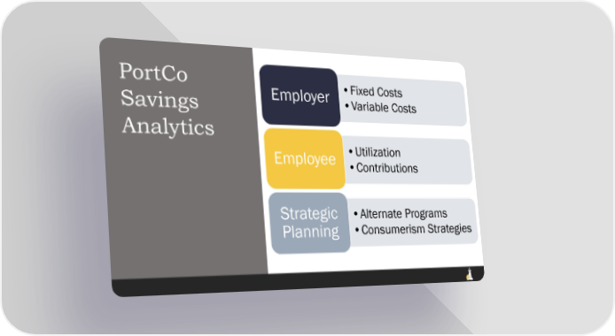 PortCo Employer •Fixed Costs Savings •Variable Costs Analytics Employee •Utilization •Contributions Strategic •Alternate Programs Planning •Consumerism Strategies