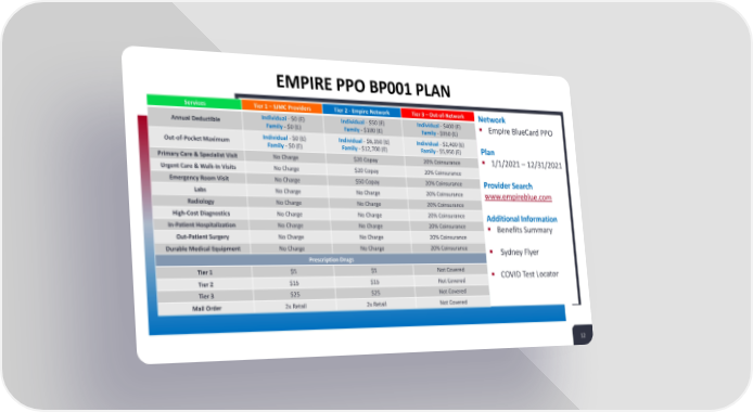 EMPIRE PPO BP001 PLAN Services Tier 1 – SJMC Providers Tier 2 - Empire Network Tier 3 – Out-of-Network Network Annual Deductible Individual - $0 (E) Individual - $50 (E) Individual - $400 (E) ▪ Empire BlueCard PPO Family - $0 (E) Family - $100 (E) Family - $950 (E) Out-of-Pocket Maximum Individual - $0 (E) Individual - $6,350 (E) Individual - $2,400 (E) Plan Family - $0 (E) Family - $12,700 (E) Family - $5,950 (E) Primary Care & Specialist Visit No Charge $20 Copay 20% Coinsurance ▪ 1/1/2021 –12/31/2021 Urgent Care & Walk-In Visits No Charge $20 Copay 20% Coinsurance Emergency Room Visit No Charge $50 Copay 20% Coinsurance Provider Search Labs No Charge No Charge 20% Coinsurance www.empireblue.com Radiology No Charge No Charge 20% Coinsurance High-Cost Diagnostics No Charge No Charge 20% Coinsurance Additional Information In-Patient Hospitalization No Charge No Charge 20% Coinsurance ▪ Benefits Summary Out-Patient Surgery No Charge No Charge 20% Coinsurance Durable Medical Equipment No Charge No Charge 20% Coinsurance ▪ Sydney Flyer Prescription Drugs Tier 1 $5 $5 Not Covered ▪ COVID Test Locator Tier 2 $15 $15 Not Covered Tier 3 $25 $25 Not Covered Mail Order 2x Retail 2x Retail Not Covered 12 12
