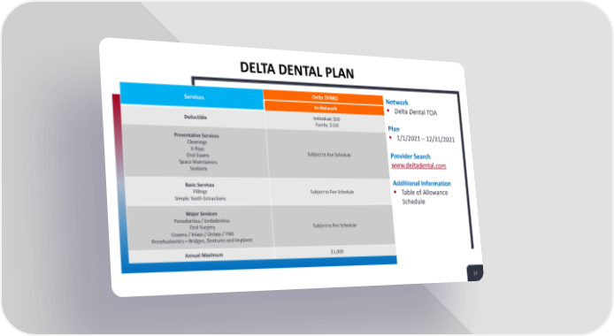 DELTA DENTAL PLAN Services Delta DHMO Network In-Network ▪ Delta Dental TOA Deductible Individual: $50 Family: $150 Plan Preventative Services ▪ 1/1/2021 –12/31/2021 Cleanings X-Rays Subject to Fee Schedule Provider Search Oral Exams Space Maintainers www.deltadental.com Sealants Basic Services Additional Information Fillings Subject to Fee Schedule ▪ Table of Allowance Simple Tooth Extractions Schedule Major Services Periodontics / Endodontics Oral Surgery Subject to Fee Schedule Crowns / Inlays / Onlays / TMJ Prosthodontics – Bridges, Dentures and Implants Annual Maximum $1,000 17 17